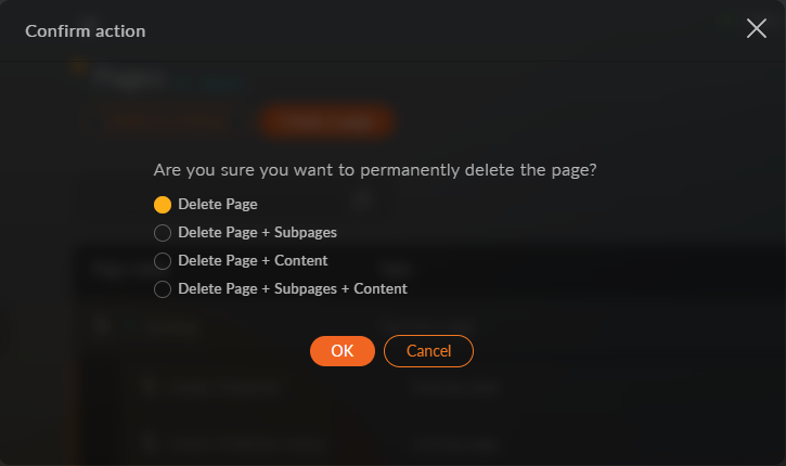 - Delete page + Subpages + Content will delete the parent page, all childsubpages, and their nested content, such as products.